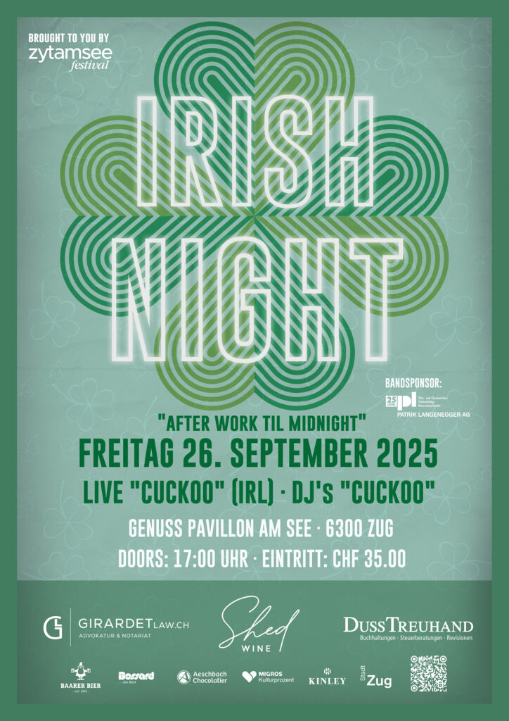 Echte Irish-Pub-Stimmung mitten in Zug! Die mitreissende irische Band Cuckoo bringt traditionelle Folk-Sounds, rockige Grooves und jede Menge gute Laune direkt in den Pavillon. Danach übernimmt Cuckoo gleich selbst das DJ-Pult – für ein energiegeladenes Set, das dich bis Mitternacht tanzen lässt. Guinness, Whiskey und Streetfood runden diesen musikalischen Freitag perfekt ab.