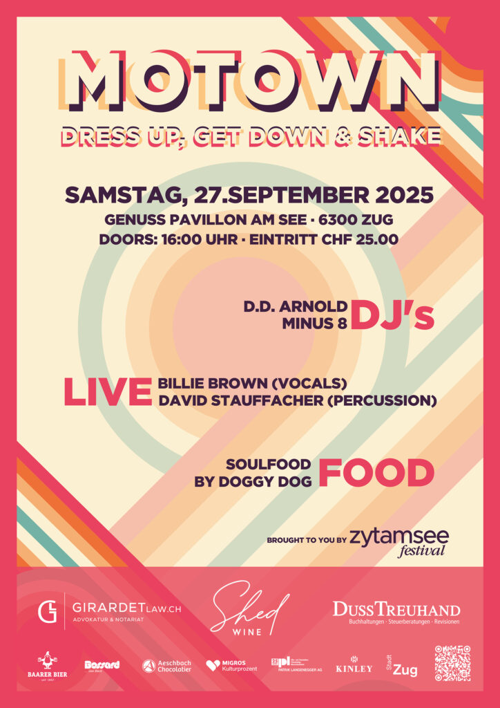 Funk, Soul und Groove – die Motown Night bringt den Pavillon zum Beben! Die DJs Minus 8 und D.D. Arnold liefern den perfekten Soundtrack: eine Reise durch die goldene Ära von Motown bis zu modernen Funk-Beats. Begleitet werden sie von David Stauffacher an der Live-Perkussion und den ausdrucksstarken Vocals von Yasmine Meguid. Ein Abend voller Rhythmus, Eleganz und Tanzgefühl – soulful, classy und voller Energie.